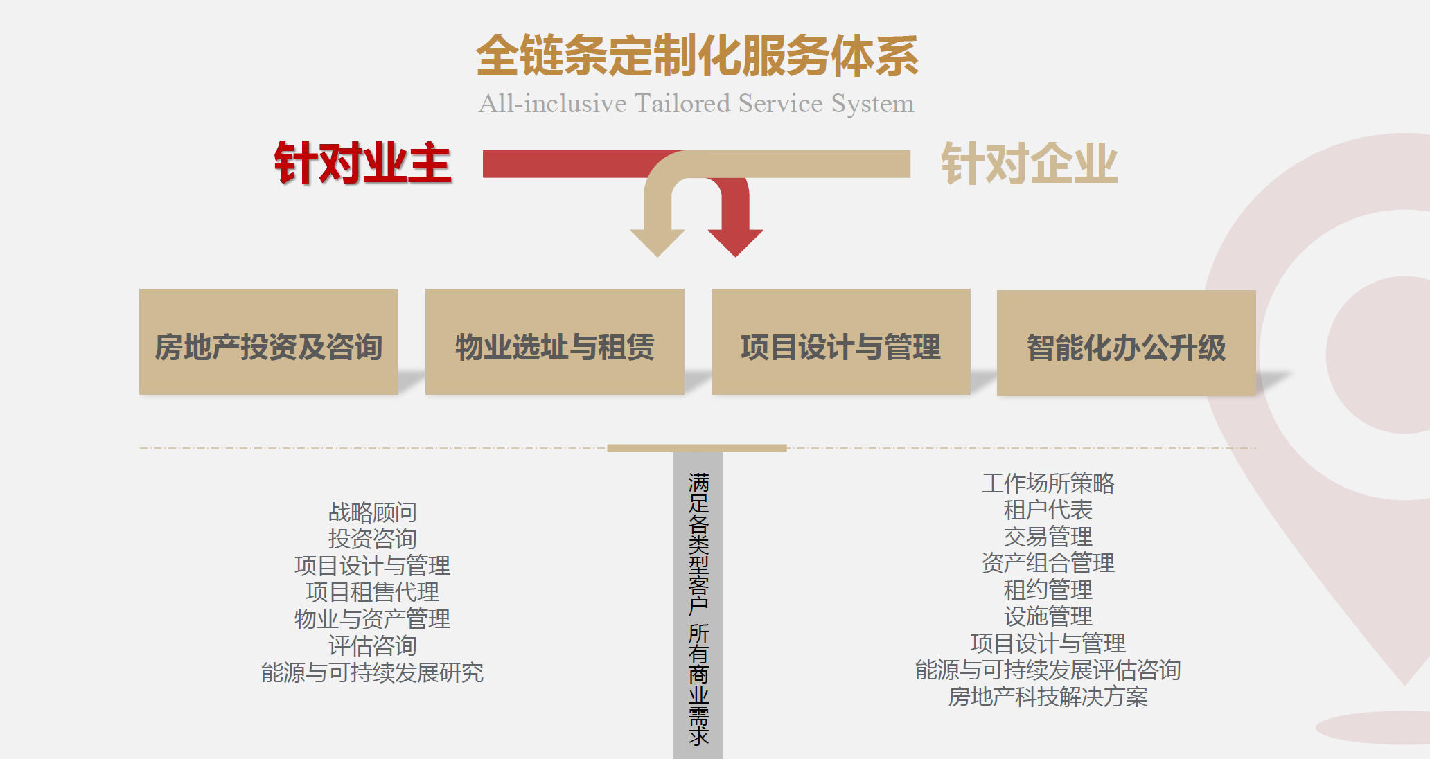 服务内容:服务内容覆盖商务办公市场核心需求,其中包括项目招商、经纪服务、空间运营、企业服务、物业管理、房地产咨询服务、空间设计与装修咨询等。欲打造创新型办公服务生态链,一站式整合系统从根本革新了当下办公领域业务运作惯性,最大化企业效能。