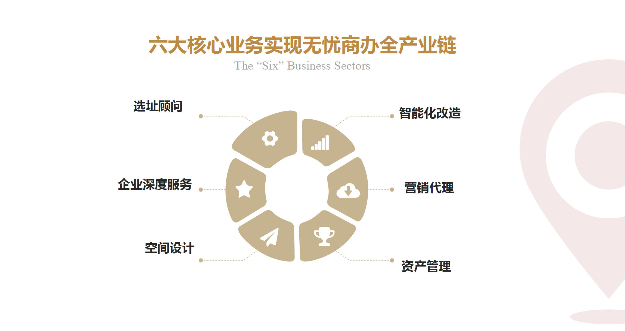 服务内容:服务内容覆盖商务办公市场核心需求,其中包括项目招商、经纪服务、空间运营、企业服务、物业管理、房地产咨询服务、空间设计与装修咨询等。欲打造创新型办公服务生态链,一站式整合系统从根本革新了当下办公领域业务运作惯性,最大化企业效能。
